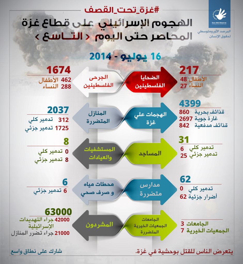 جنيف-نشر المرصد الأورومتوسطي لحقوق الإنسان، ومقرّه جنيف، إحصائية مبدأية لحصيلة الهجوم الإسرائيلي على قطاع غزة المحاصر حتى منتصف ليل يومه التاسع.
